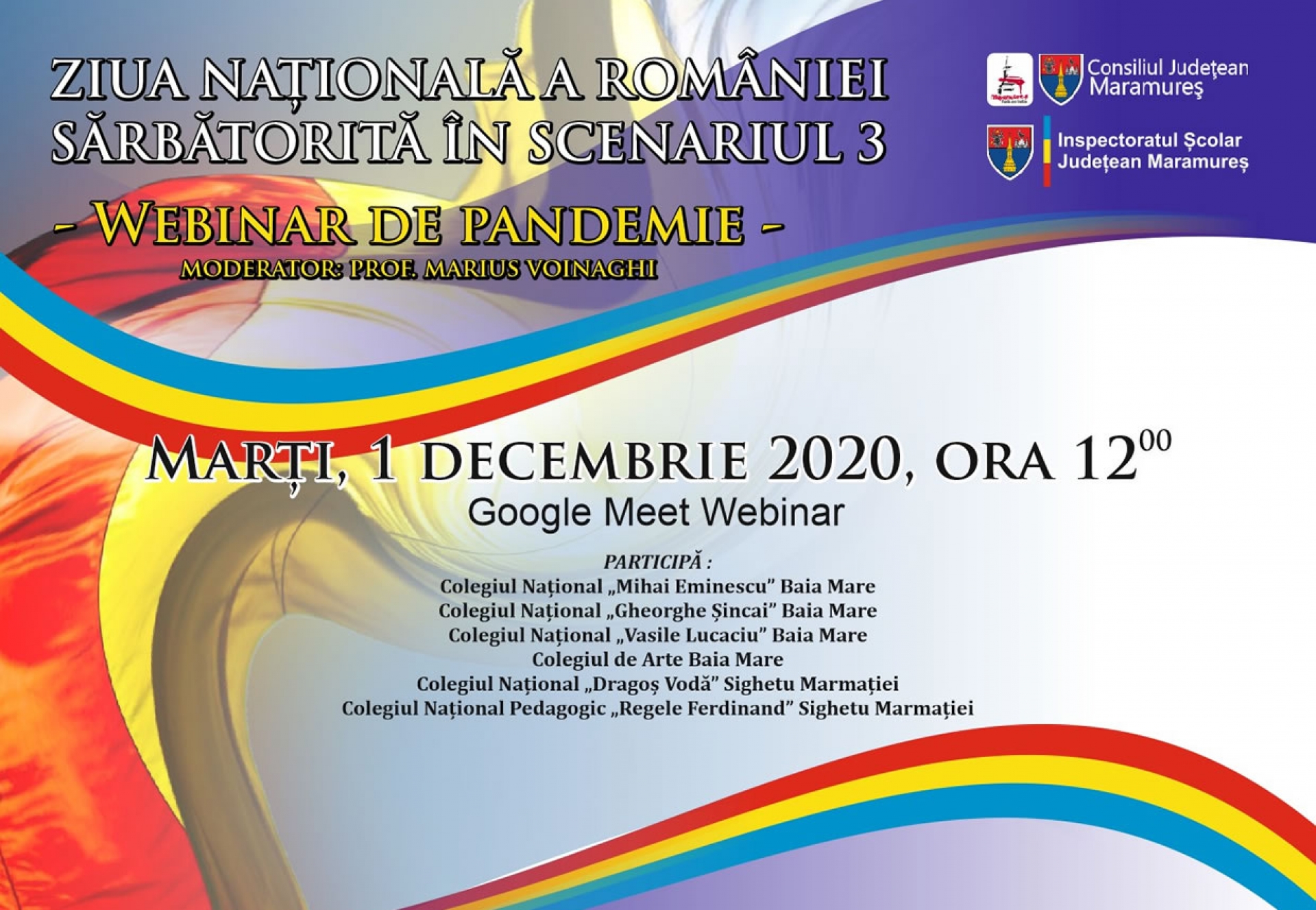 Eveniment organizat de Inspectoratul Școlar Judeţean Maramureş Pe 1 decembrie 2020, de la ora 12:00, Inspectoratul Școlar Județean Maramureș în parteneriat cu Consiliul Județean Maramureș desfășoară proiectul “Ziua Națională în scenariul 3”, un webinar în cadrul căruia reprezentanți ai celor șase colegii naționale din județ vor sărbători Ziua Națională a României "altfel”.